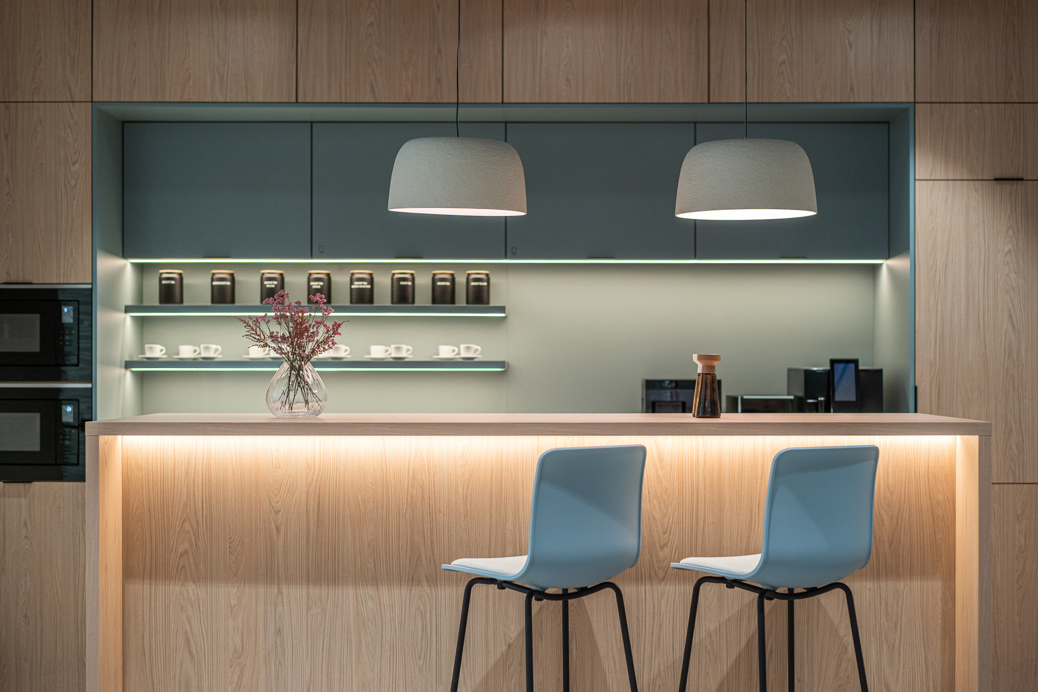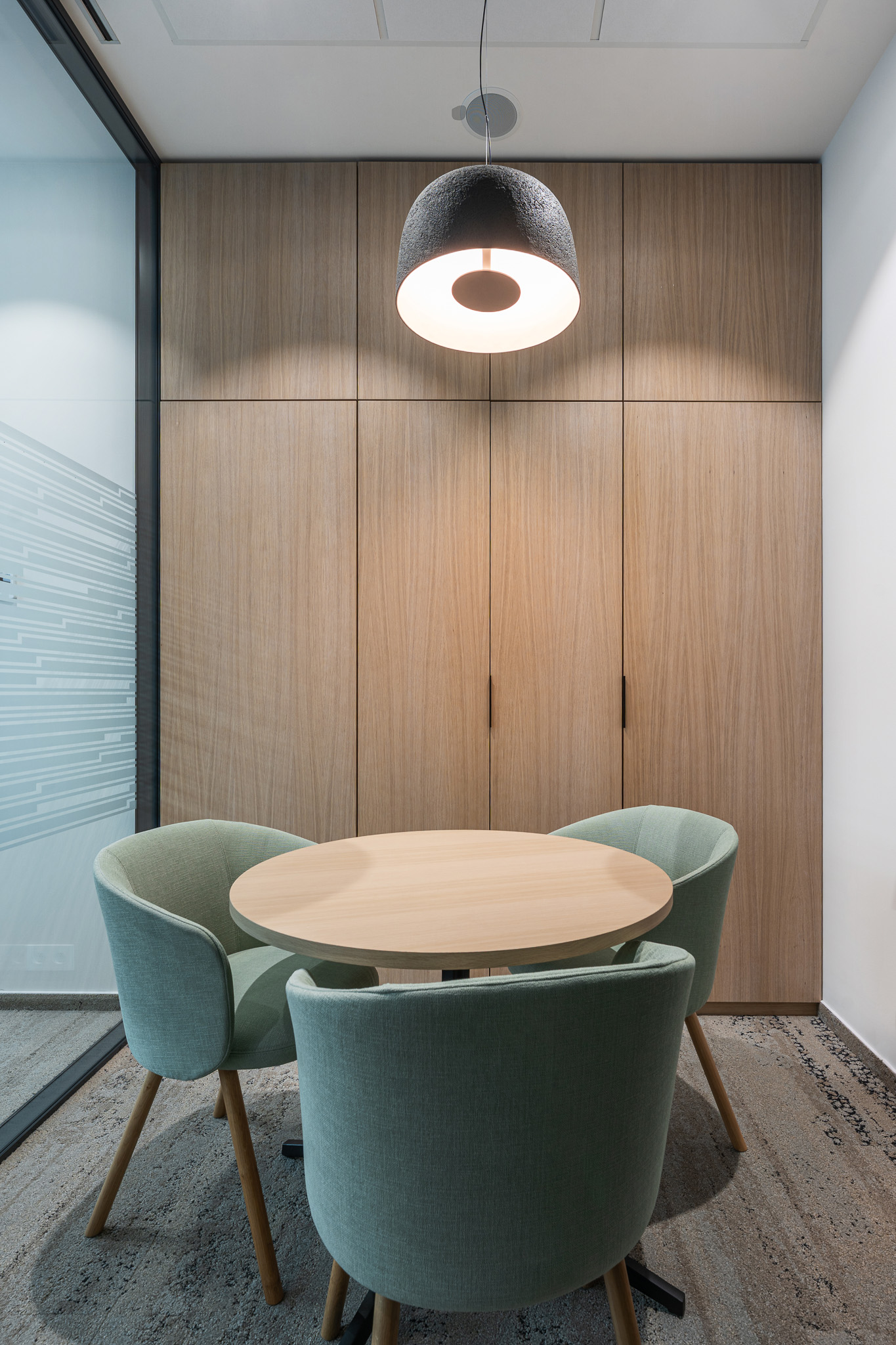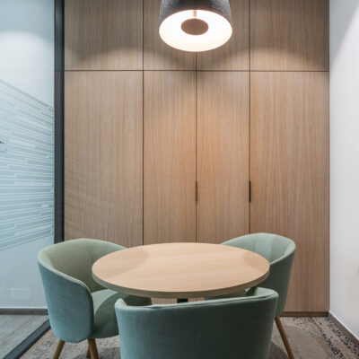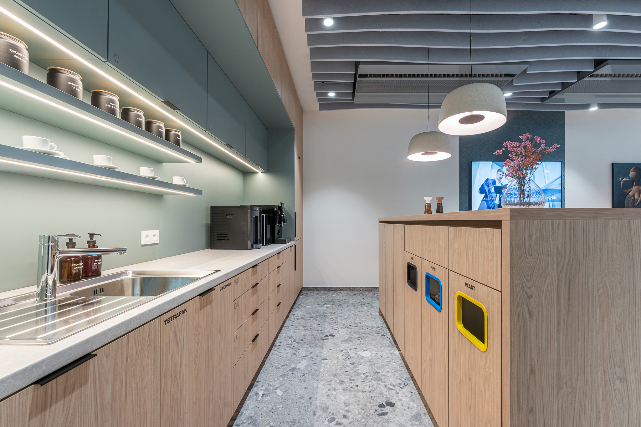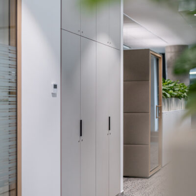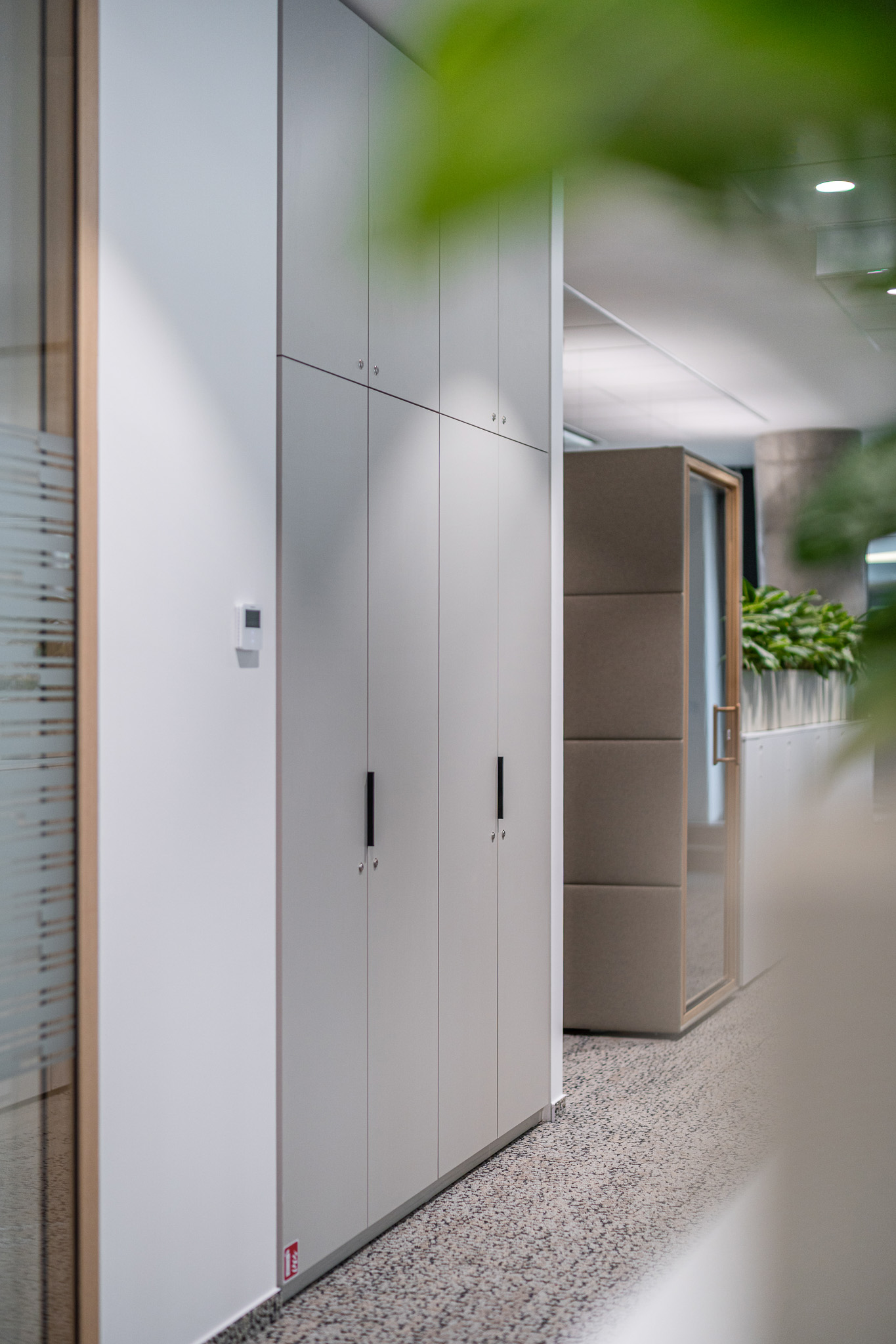 The reception area features a custom-built reception desk with veneered wall panels. In the spacious kitchen and dining area, we installed a fully equipped kitchenette and upholstered benches. Five meeting rooms are complemented by built-in cabinets and decorative acoustic panels, as well as custom-made wardrobes with lockers.