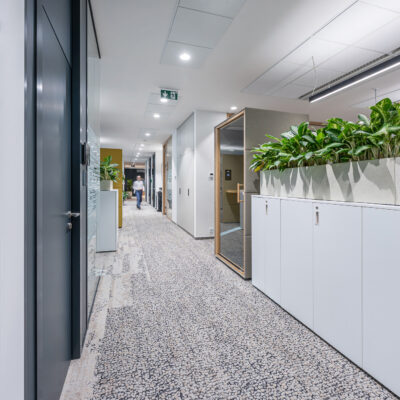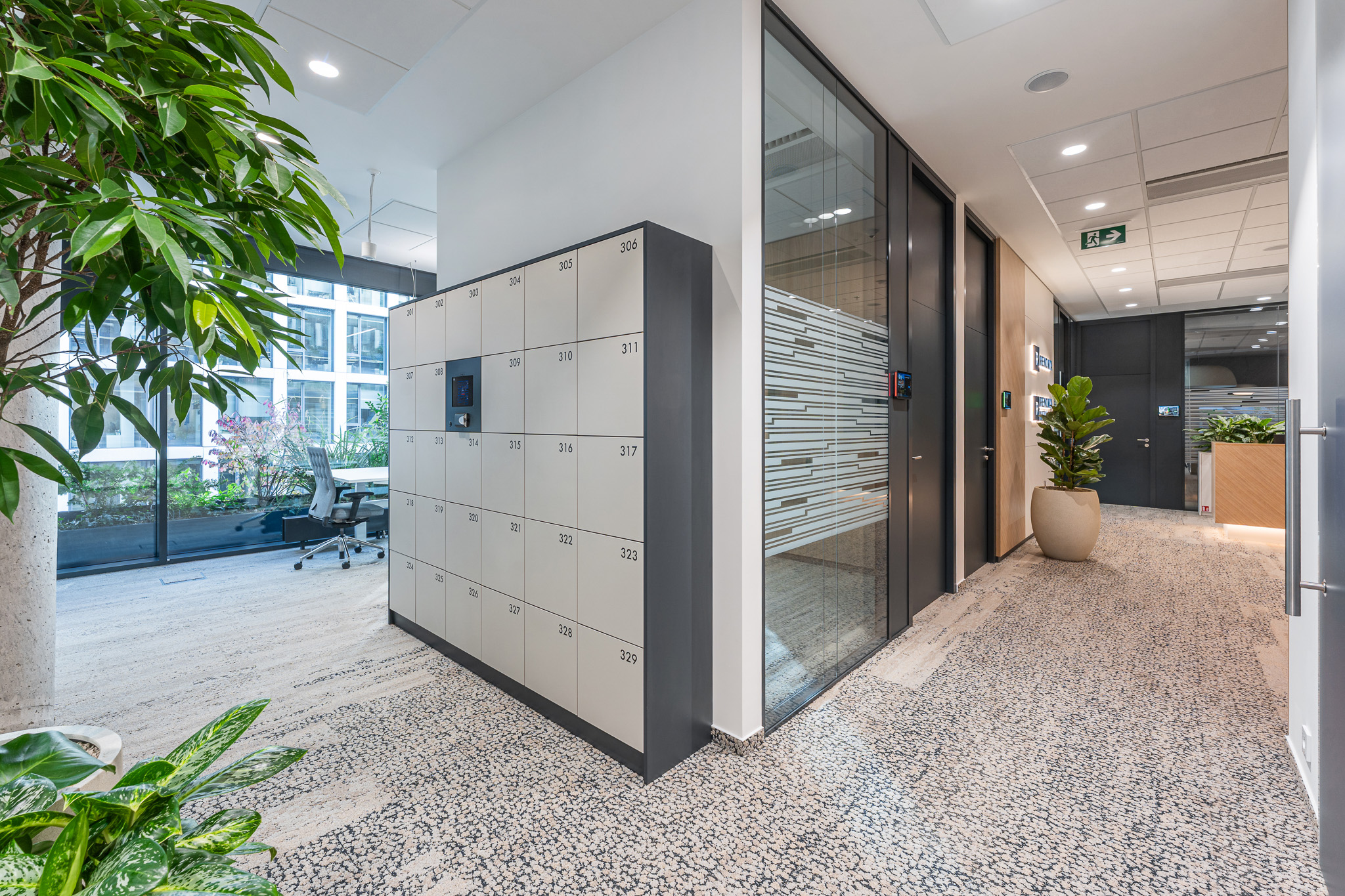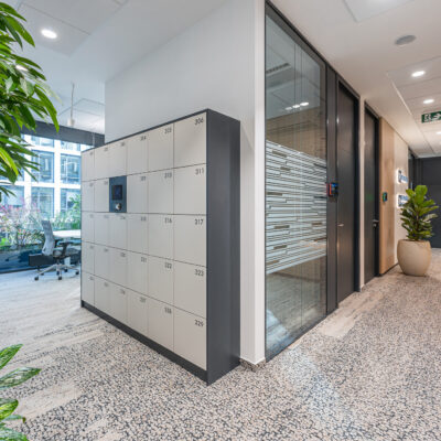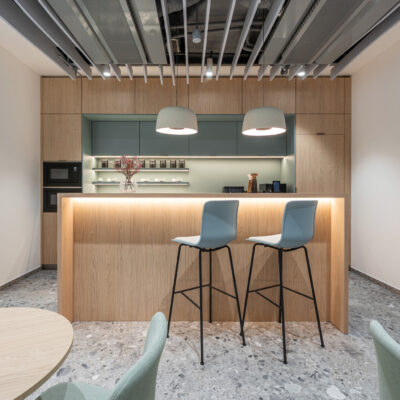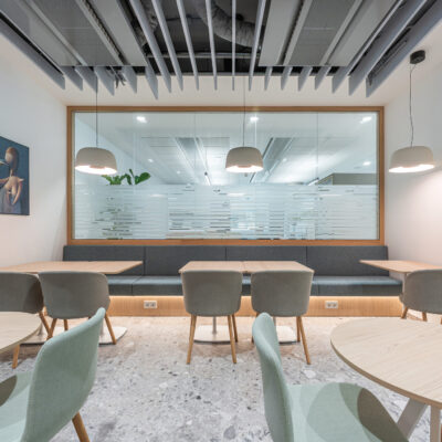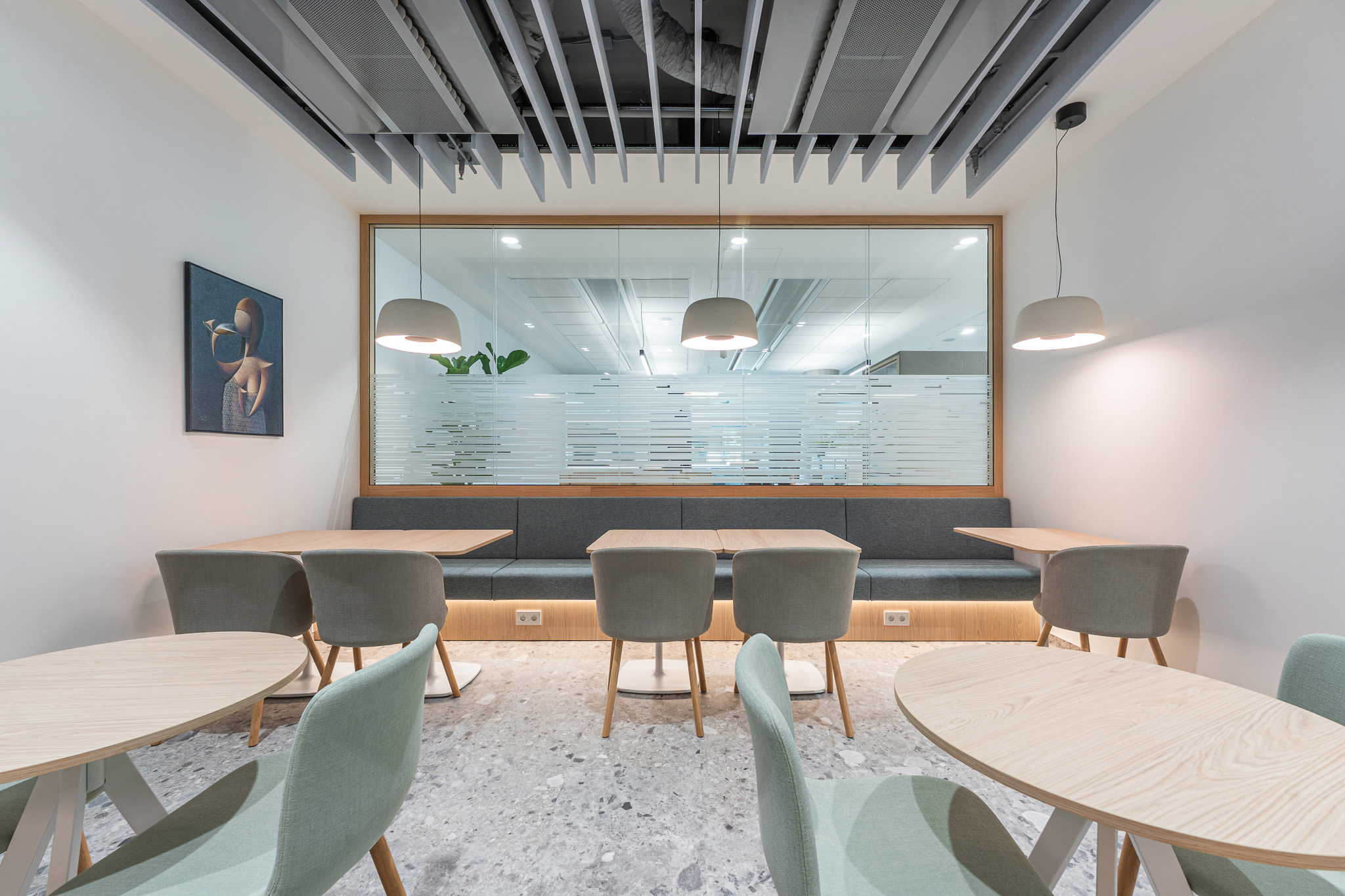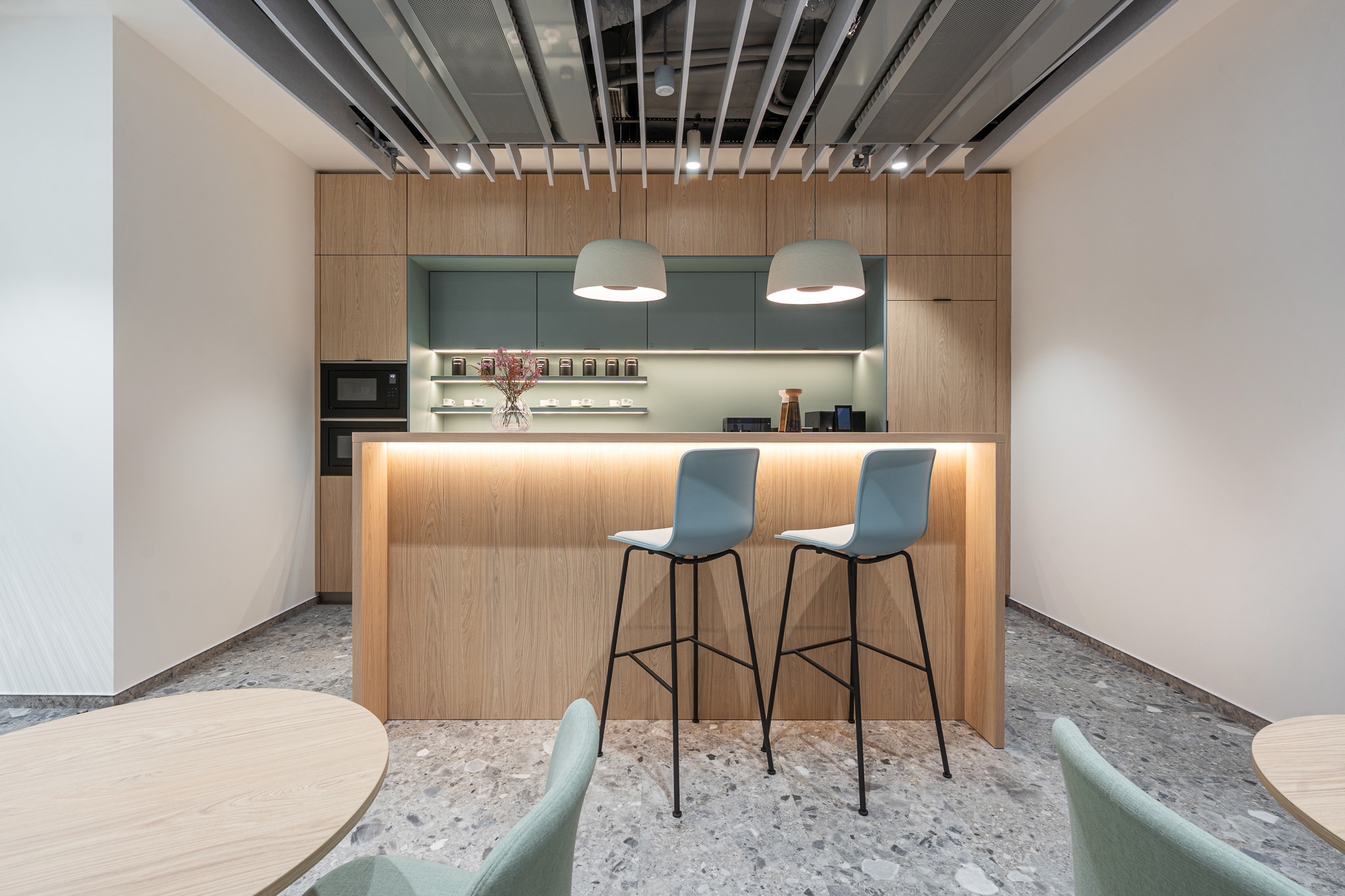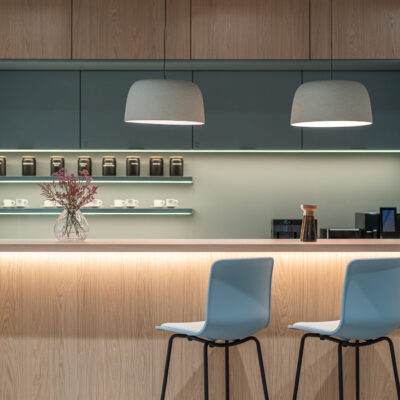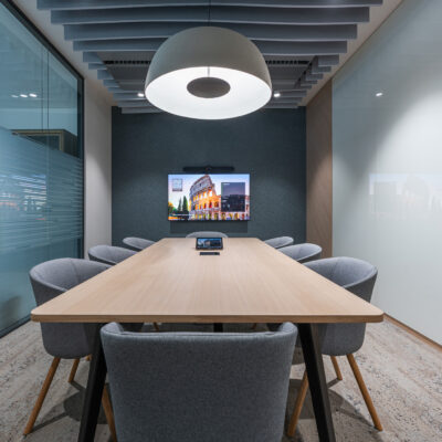 The reception area features a custom-built reception desk with veneered wall panels. In the spacious kitchen and dining area, we installed a fully equipped kitchenette and upholstered benches. Five meeting rooms are complemented by built-in cabinets and decorative acoustic panels, as well as custom-made wardrobes with lockers.