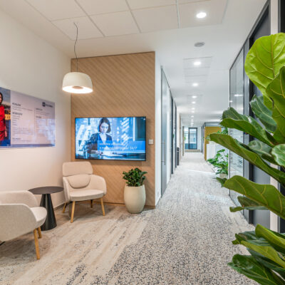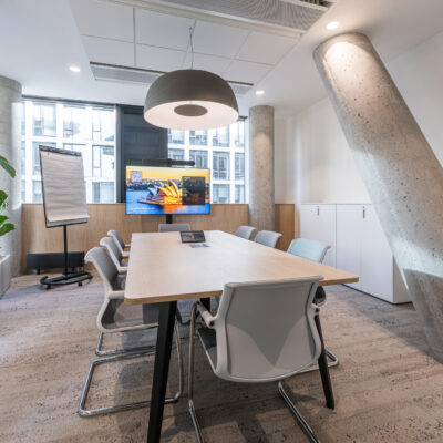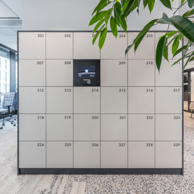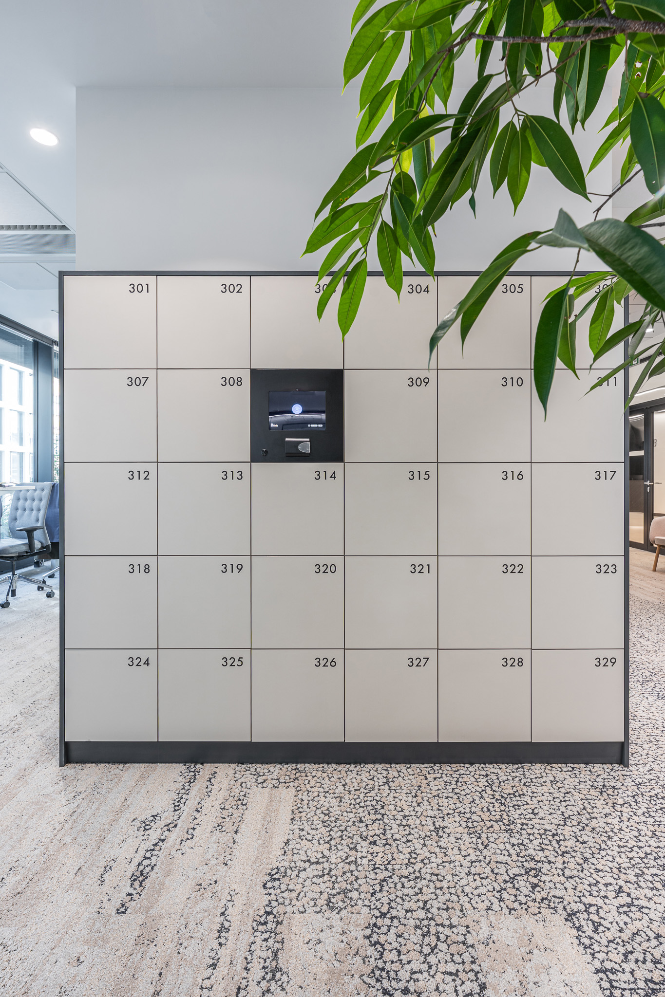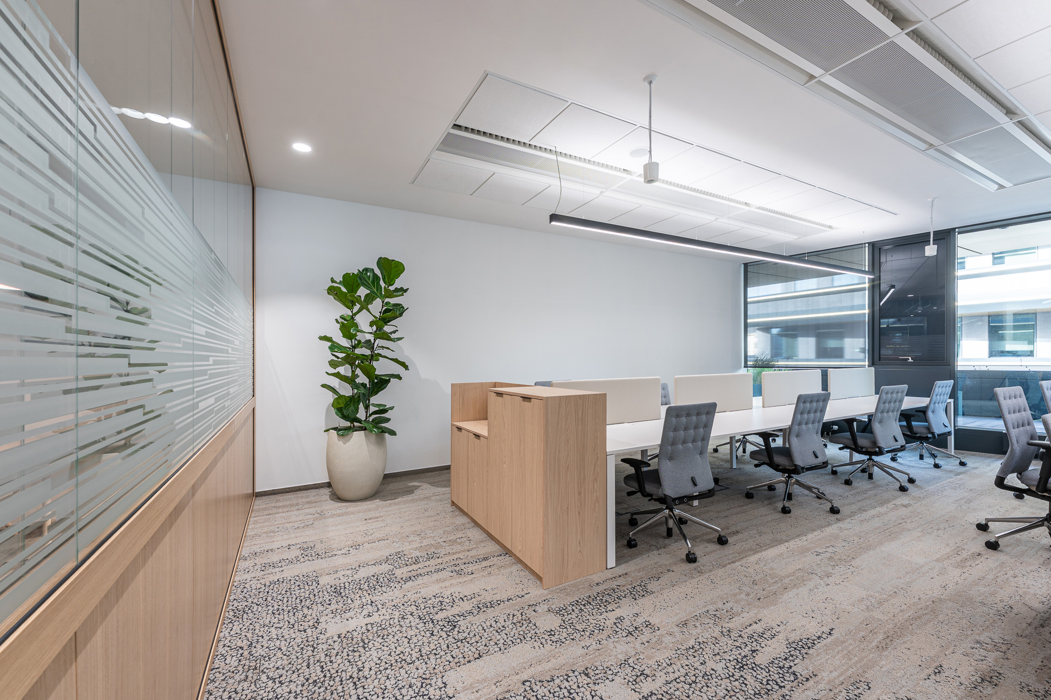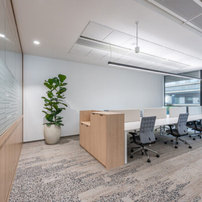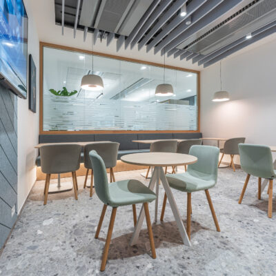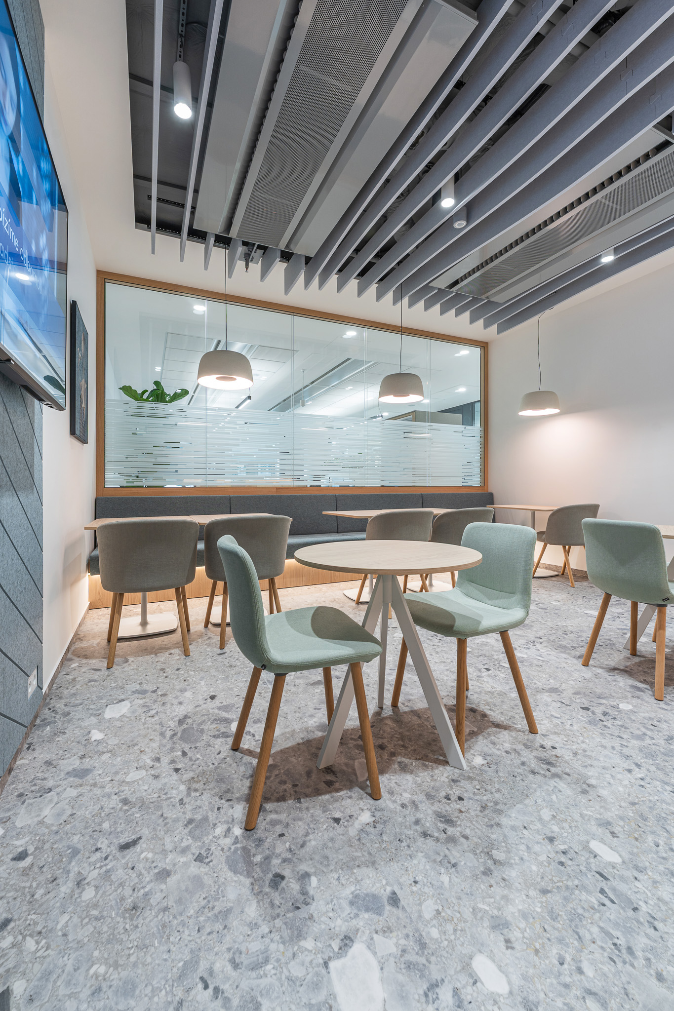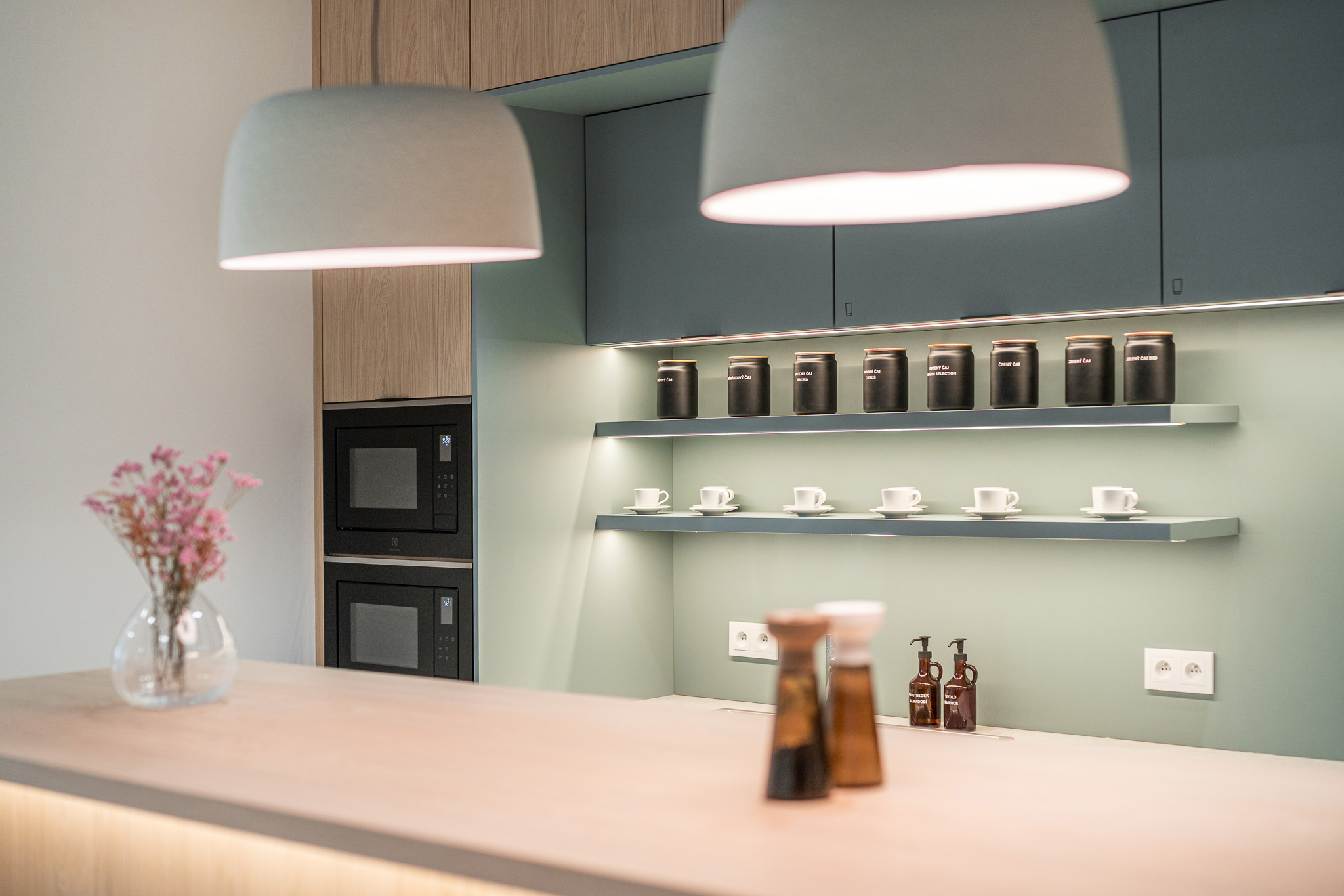 The reception area features a custom-built reception desk with veneered wall panels. In the spacious kitchen and dining area, we installed a fully equipped kitchenette and upholstered benches. Five meeting rooms are complemented by built-in cabinets and decorative acoustic panels, as well as custom-made wardrobes with lockers.