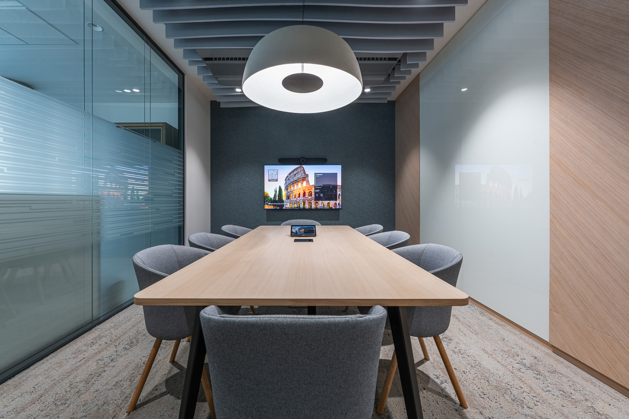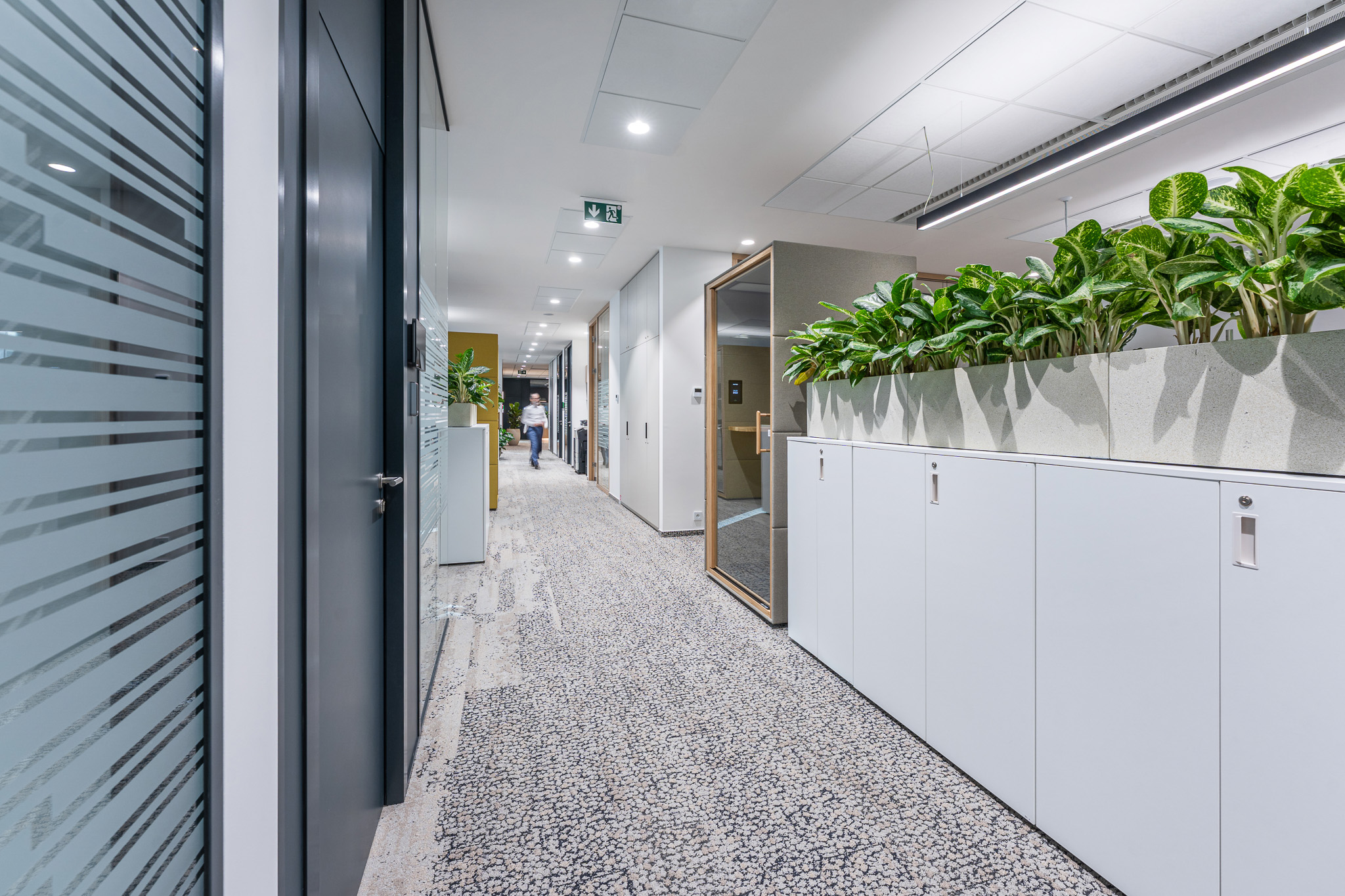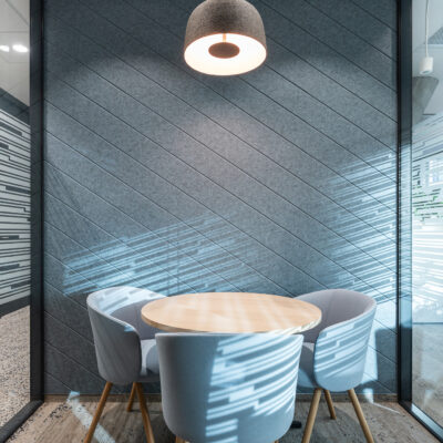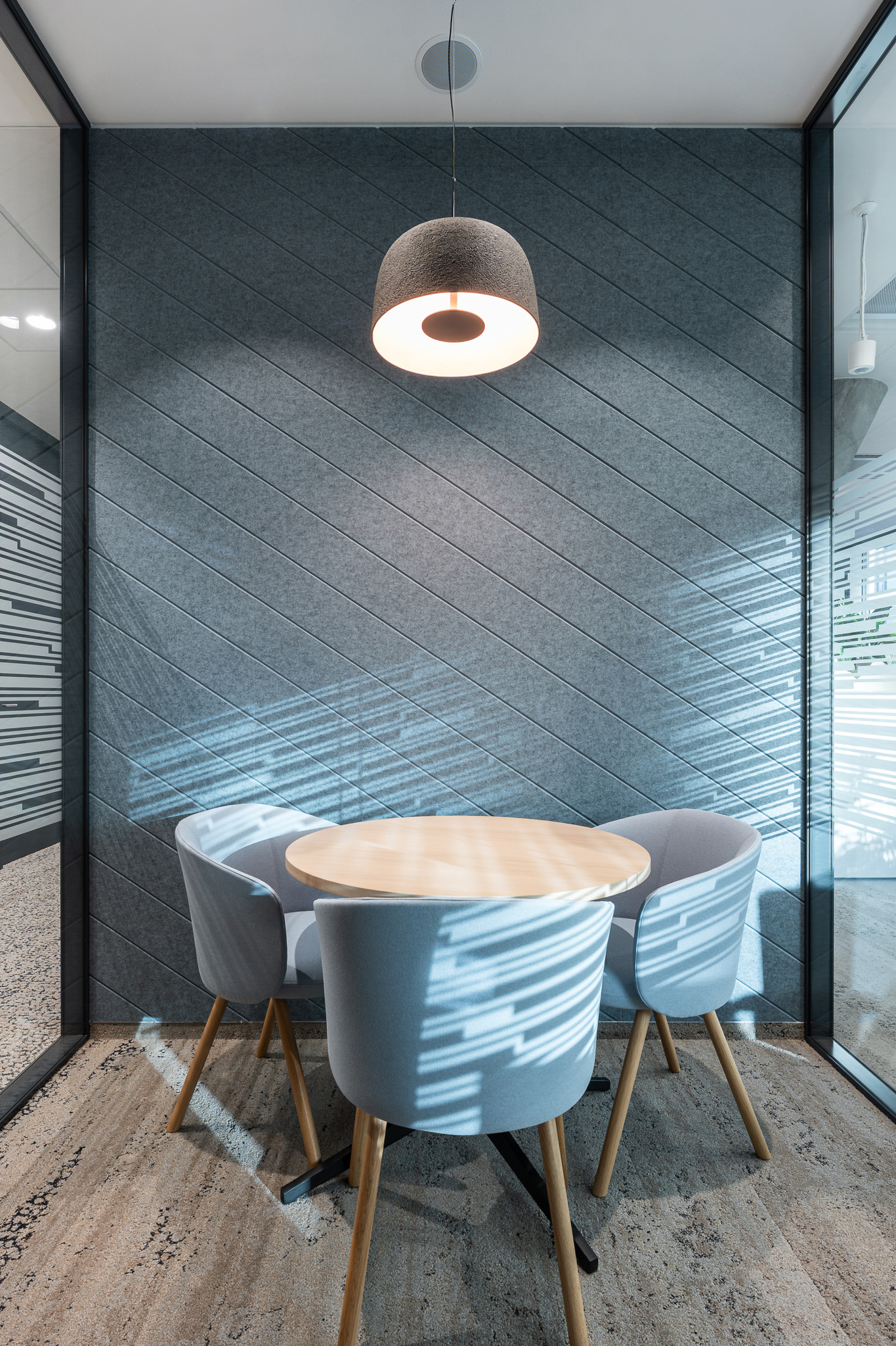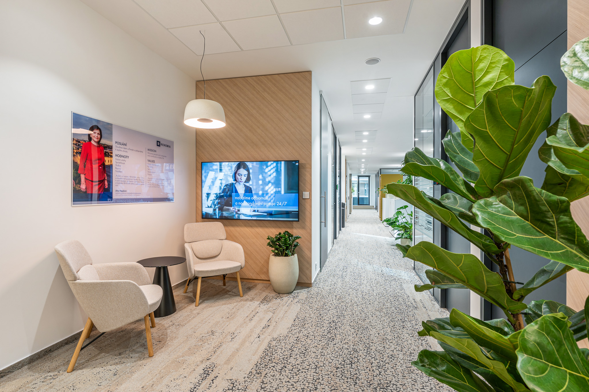 The fit-out of the Prague branch of Renomia builds on the completed Bratislava project. Just like in the Slovak office, we designed and supplied custom-made furniture, veneered wall claddings, and Echoblock acoustic panels by Moodpasta.
