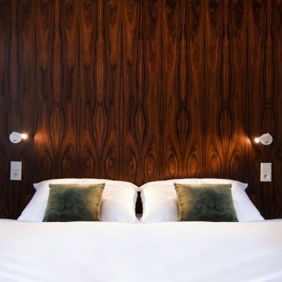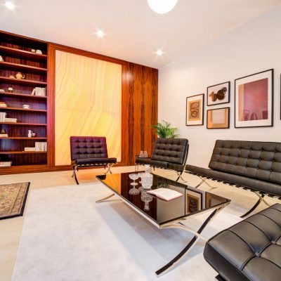 Interior of the apartment in the Toman Hotel. This time in a functionalist style. Natural veneer, metal and natural stone.