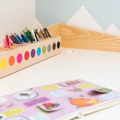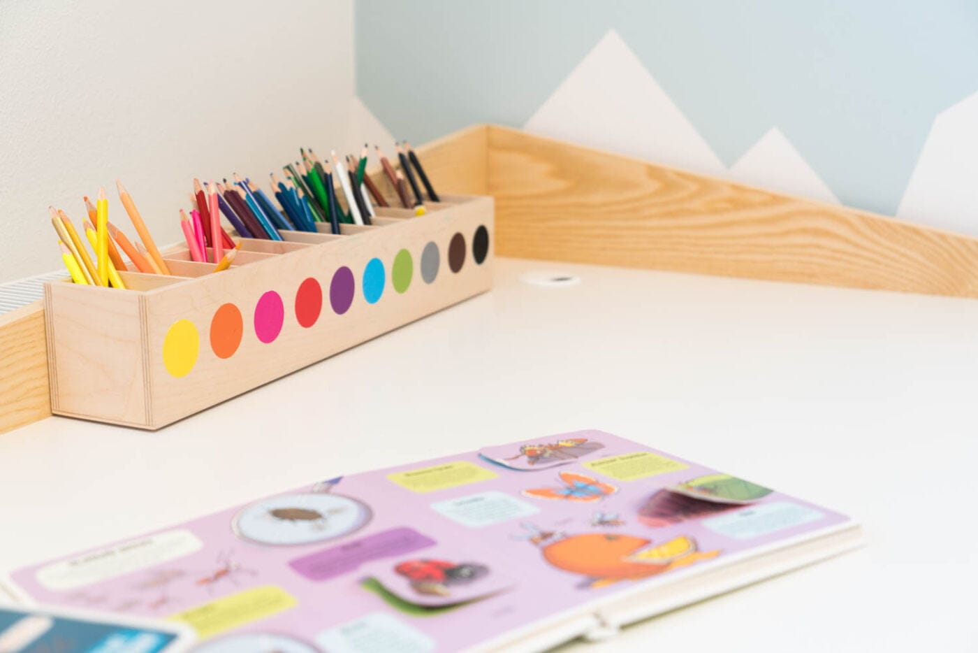 The desk was made long enough to serve both children over time. Playful yet practical accessories in the form of nets and distinctive handles on the cabinets, which can also serve as hangers, are an original addition that adds to the uniqueness of this room.