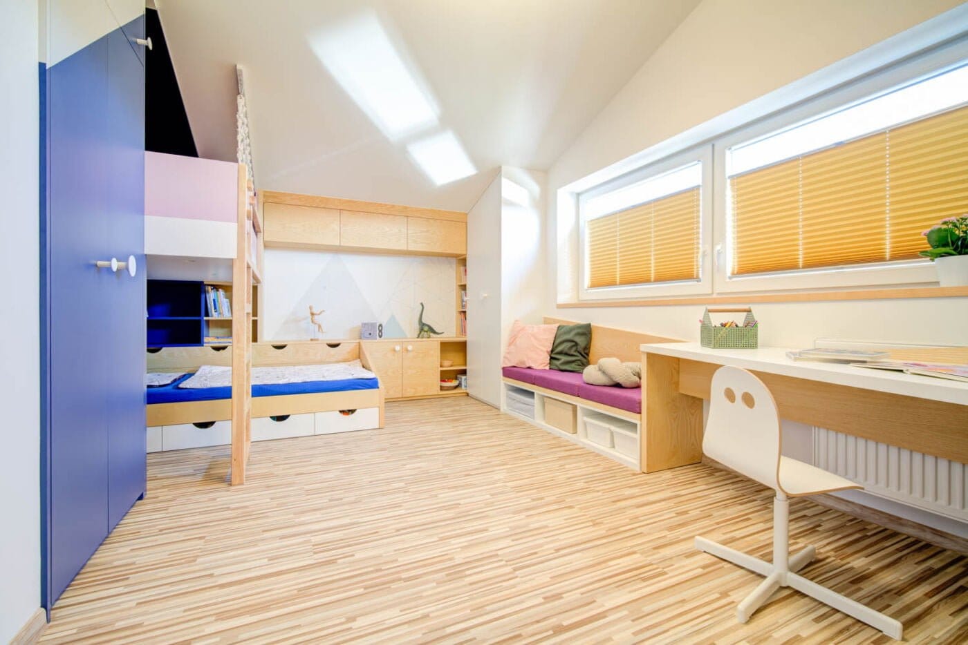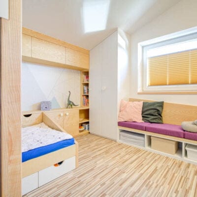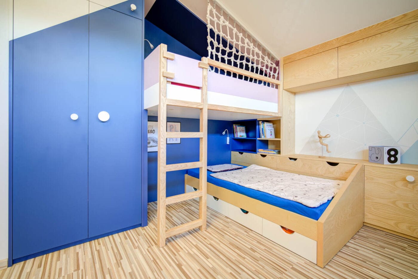 The sleeping area is dominated by a solid wood bed, where we had a small safety barrier made at the client’s request, which can be easily removed. The sleeping area is followed by storage compartments and a bench seat with upholstered seat cushions. We complemented the wooden decor with cabinets made of coloured laminate, which enlivened the overall space.