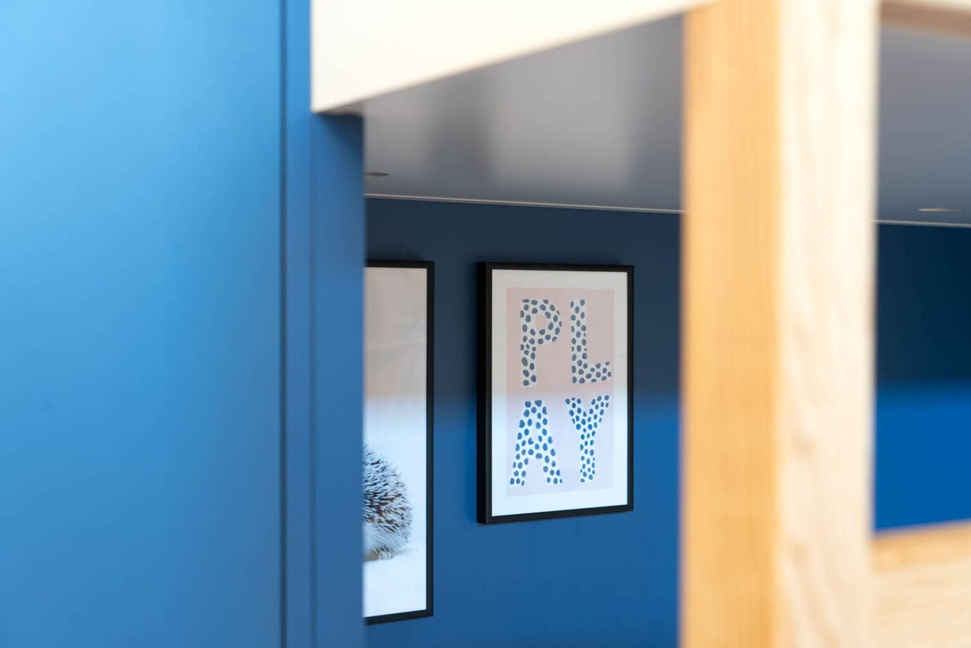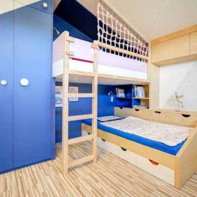 In a room for two children, we needed to get as much space as possible, so all the furniture was made to measures and not an inch of space was wasted.