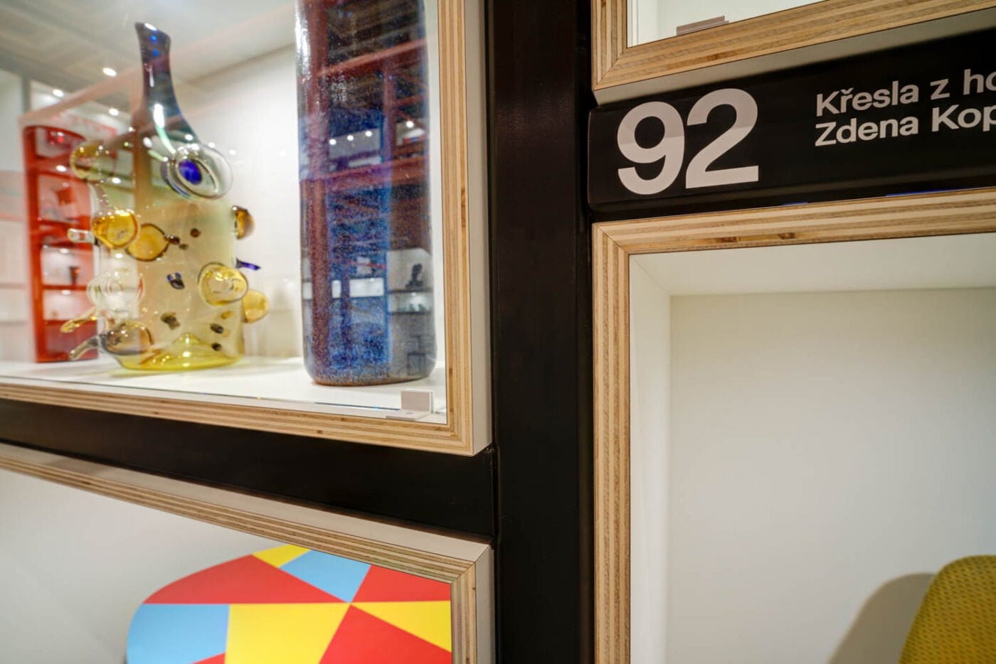 Furniture made of birch plywood looks very minimalistic and the only playful element is its edge, where you can see the layers that glue it together. It’s the admission of this detail that we love about plywood and it stands out in the furniture set behind the reception desk. The reception desk gives a monolithic impression and is adorned only with the Designshop logo. We also used plywood to make tables to display various products and display cabinets with glass inserts. A custom-made lockable cabinet with safety glass is used to present mainly art jewellery. Birch plywood was also used in the production of exhibition cabinets for the permanent exhibition Art Design Fashion and especially its part Cave: Panorama of Design, which presents products from the rich industrial history of Brno, Moravia and the Czech lands.