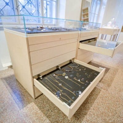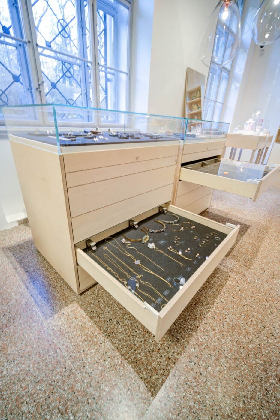 For the Moravian Gallery in Brno, we realized the complete equipment of their Designshop, which is located immediately at the entrance to the gallery. The minimalist design and light tones of the shop make all the artworks you can buy in the Designshop stand out. These are original original products and entire collections from different designers. In the shop you will find handmade jewellery, glass, leather, wood and other pieces made of different materials. The shop itself is actually a kind of art “work” made of wood, which we have made from an increasingly popular material – birch plywood in natural finish.