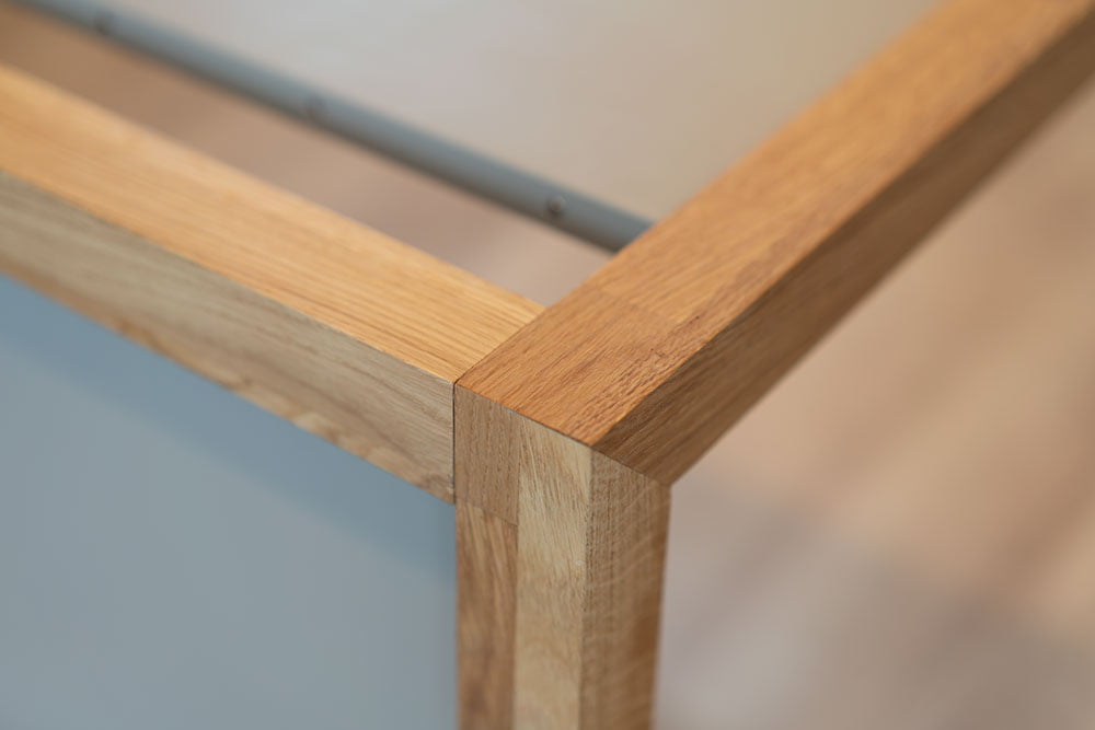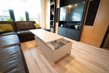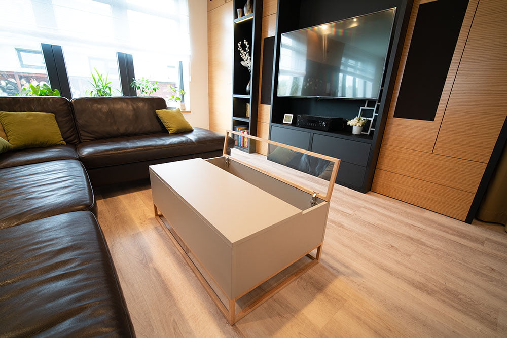 is a designer coffee table with plenty of storage space and a pull-out top that is very comfortable for work or dining. Table dimensions 400 x 600 x 1000 mm (height x depth x width). Pull-out plate up to 600 mm. Solid oak construction, oil finish. 18mm LTD.
